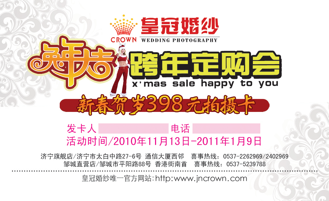 憑此卡在跨年定購會(huì)期間預(yù)約婚紗照可享受八大優(yōu)惠及100%抽獎(jiǎng)(限活動(dòng)期間)